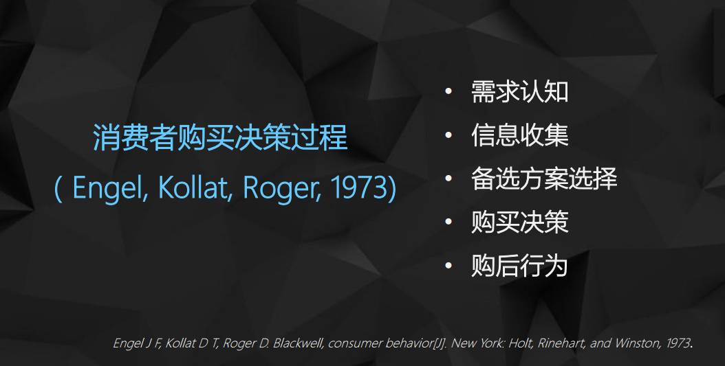 这里引入的第二个营销理论是很多人熟知的“消费者购买决策过程”,包括:需求认知、信息收集、备选方案选择、购买决策和购后行为。广告投放的过程不光要对用户进行分类,也要了解它所处的决策阶段。