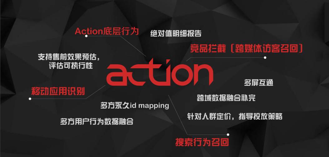 Action的4个主要功能包括:“竞品拦截”,将一段URL给到系统,根据它找到访问过的顾客;“搜索行为”,根据给到系统的关键字,找出对应的顾客;“app行为识别”,通过DPI技术,完整识别app生命周期中的核心行为;“底层行为“,例如在电商领域,Action能够将用户的浏览,收藏,下单等行为完整的记录并解析,从中找出具有价值的行为和消费动机。