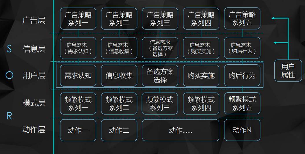 将上述理论结合,以SOR模型作为竖坐标,决策过程作为横坐标可以发现:广告代表的信息层既可以在不同的阶段对消费者进行刺激,从而影响行为的产生。反过来,广告主也能够根据消费者行为,判断他所处的决策阶段,针对性的推出他所需要的信息和广告。