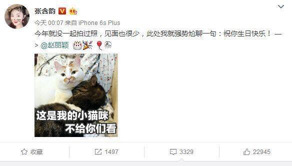 张含韵在自己的社交媒体平台上,为当红影星赵丽颖送上生日祝福,并且配发一张图片,是一只白猫搂着一只黑猫的亲昵照片。谁知道祝福刚刚发出去不久,便被眼尖的网友发现不妥之处。