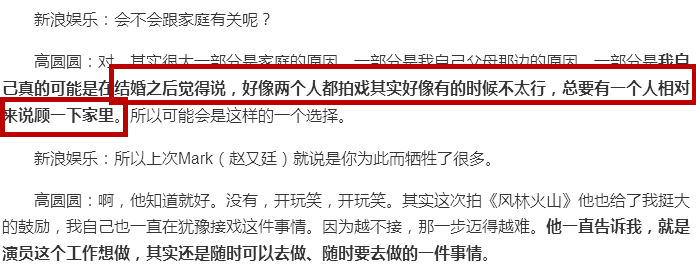 高圆圆是一个家庭观念高于事业心的人,结婚后,她坦言两个人都工作会照顾不到家庭,所以索性停工、半隐退,好几年没有出来拍戏。