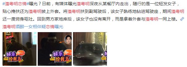 近日,有媒体曝光了潘粤明深夜密会神秘女的照片,神秘女性还开潘粤明的车送他回家,疑似有新恋情。