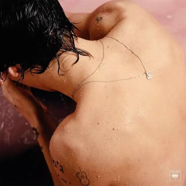 Harry背对镜头蜷着身子坐在水中,周围随意漂浮着花朵和电子金属元件,融洽的不和谐感。湿身画面让他成为粉丝口中十足的性感炸弹,而这大都要归功于浴缸中时髦的千禧粉(这个词源自这种颜色出现于千禧年之后,不饱和且高级,《New York》称之为俗气而真诚、摩登又怀旧的颜色)液体。