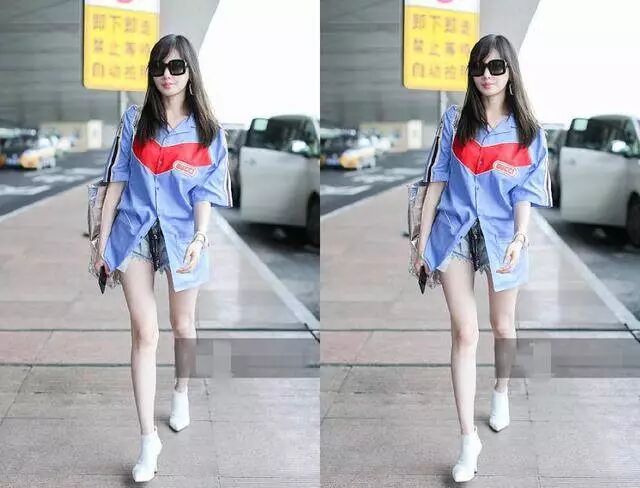 以前,只是知道张天爱的身材好,168cm高挑身材,却不知道她的腿原来这么的细长。套上一条水洗磨白的牛仔短裤,时下流行的裤子反穿,看起来不至于太过单调,和上身的衬衫搭配起来,显得双腿更加的白皙和修长。