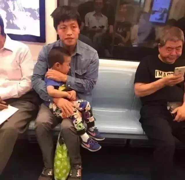 西安地铁上,即便旁边还有一个空座,但父亲还是坚持抱着孩子。