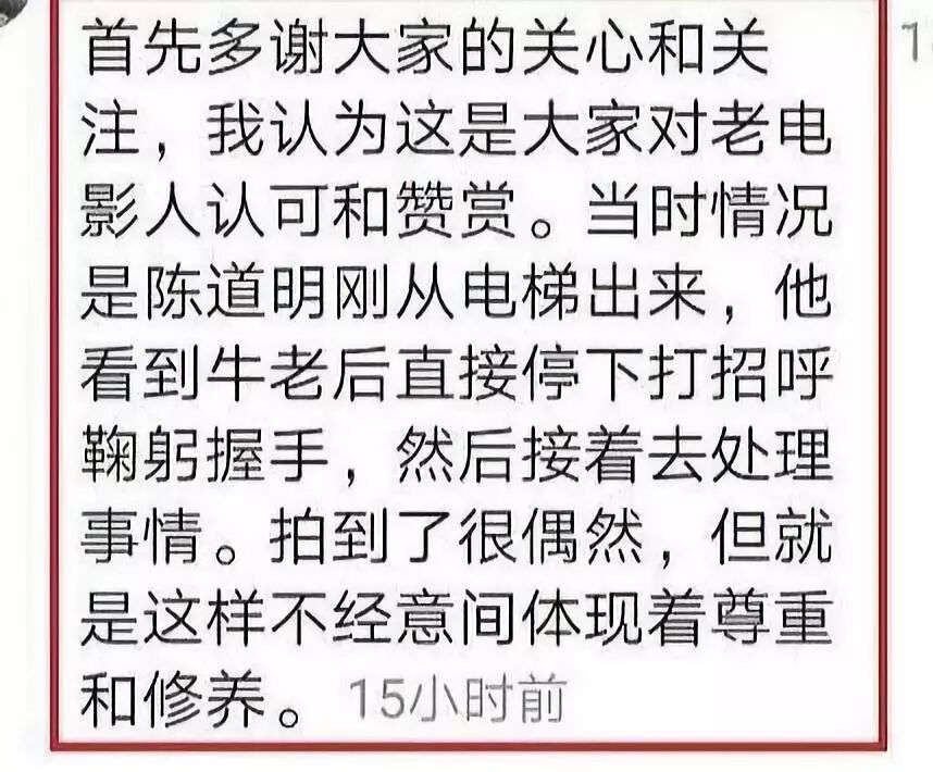 陈道明隔着人群看到牛犇老师,立刻点头弯腰问候。