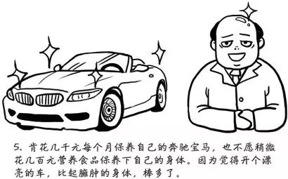 5、肯花几千元每个月保养自己的奔驰宝马,也不愿稍微花几百元营养品保养下自己的身体,因为觉得开个漂亮的车,比臃肿的身体,棒多了。