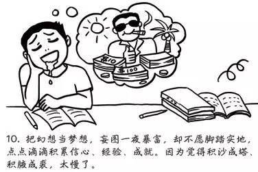 10、把幻想当梦想,妄图一夜暴富,却不愿脚踏实地,点点滴滴积累信心、经验、成就,因为觉得积沙成塔、集腋成裘,太慢了。