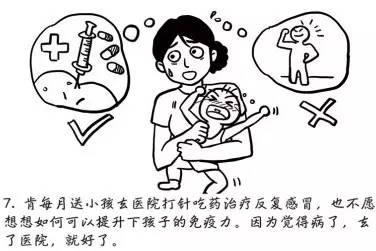 7、肯每月送小孩去医院打针吃药治疗反复感冒,也不愿想想如何可以提升下孩子的免疫力,因为觉得病了,去了医院,就好了。