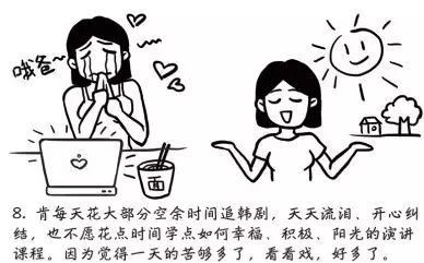 8、肯每天花大部分空余时间追韩剧,天天流泪,开心纠结,也不愿花点时间学习如何幸福、积极、阳光的演讲课程。因为觉得一天的苦够多了,看看戏,好多了。