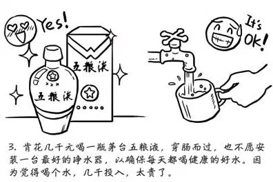 3、肯花几千元喝一瓶茅台、五粮液,也不愿意安装一台好一点的净水器,以确保家人每天都喝上干净、健康的水,因为喝个水得花好几千,太贵了。