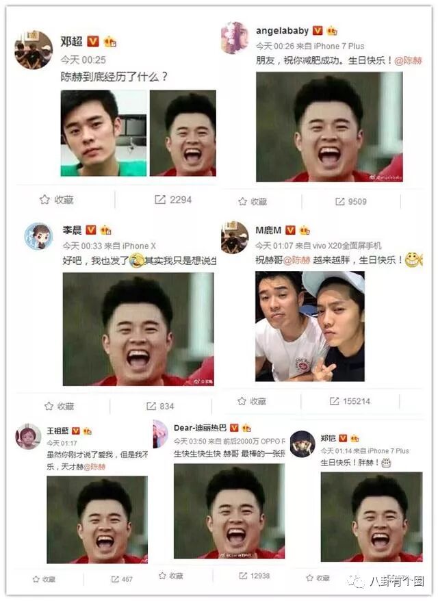 而这次祝福,看下跑男团的全体截图,一眼望出去,全是长着大嘴,膨胀的陈赫照片~~~