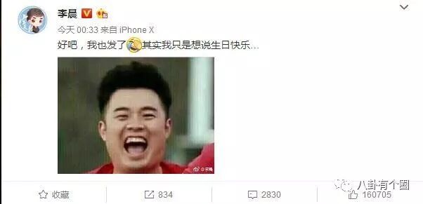 然后是李晨在33分,紧跟兄弟步伐,委屈说只想说句生日快乐,但无奈兄弟团要这样发,他也很无奈。。。