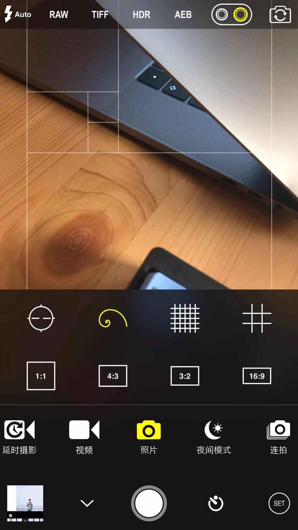 同时还有各种网格线和画幅比,适合构图参照。拍摄模式也有HDR,存储格式有RAW,TIFF两种,是为数不多支持RAW的,第一次看见能存TIFF的软件。