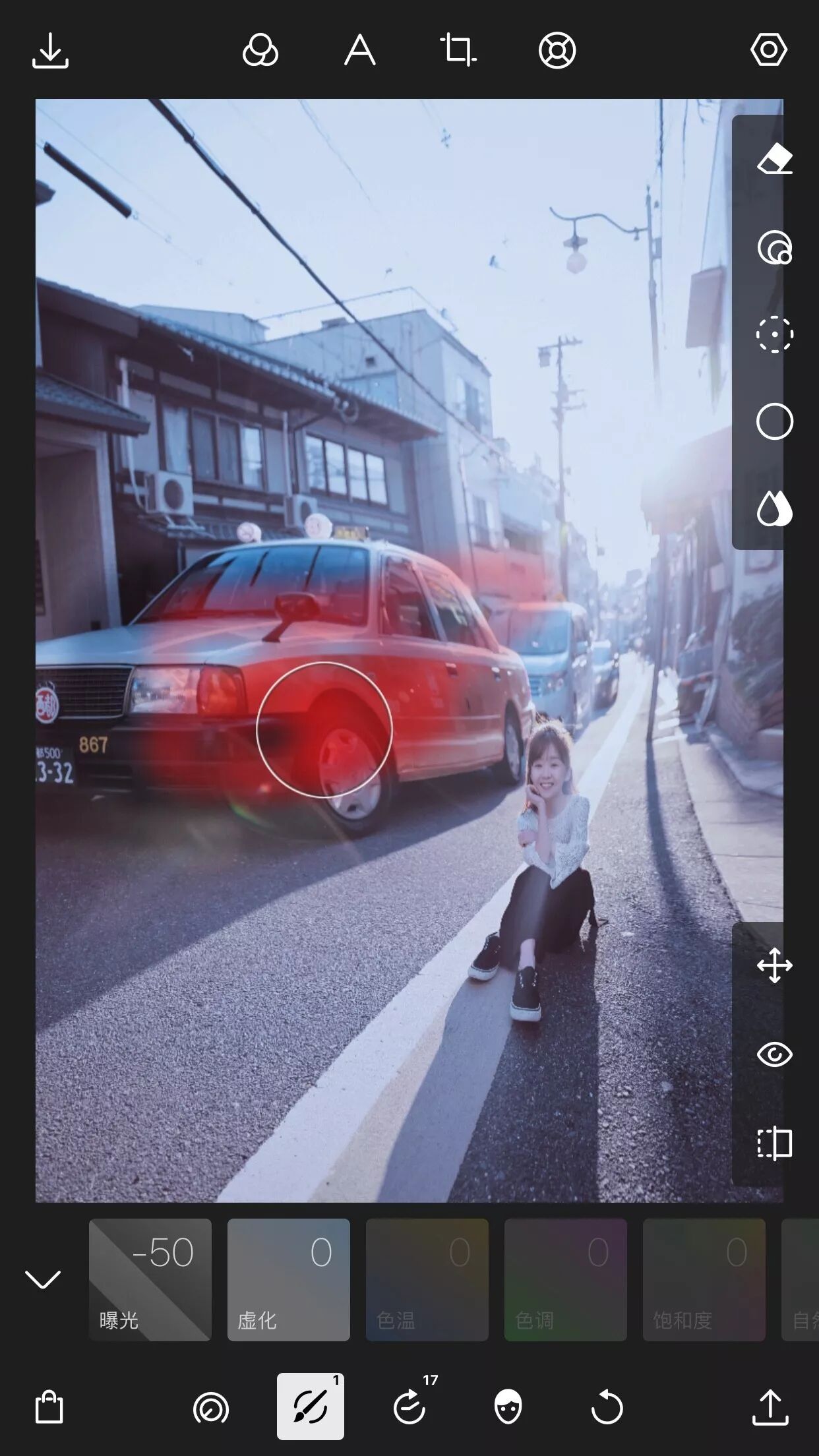 一个就是色调的调整。根据红绿蓝直方图,在下方调整阴影高光等等色调,除了局部调整以外,还能在上方的横向进度条进行细微的调整。这点很赞。其实在电脑的PS中,调整肤色和其他颜色,大致也是这么个路数。