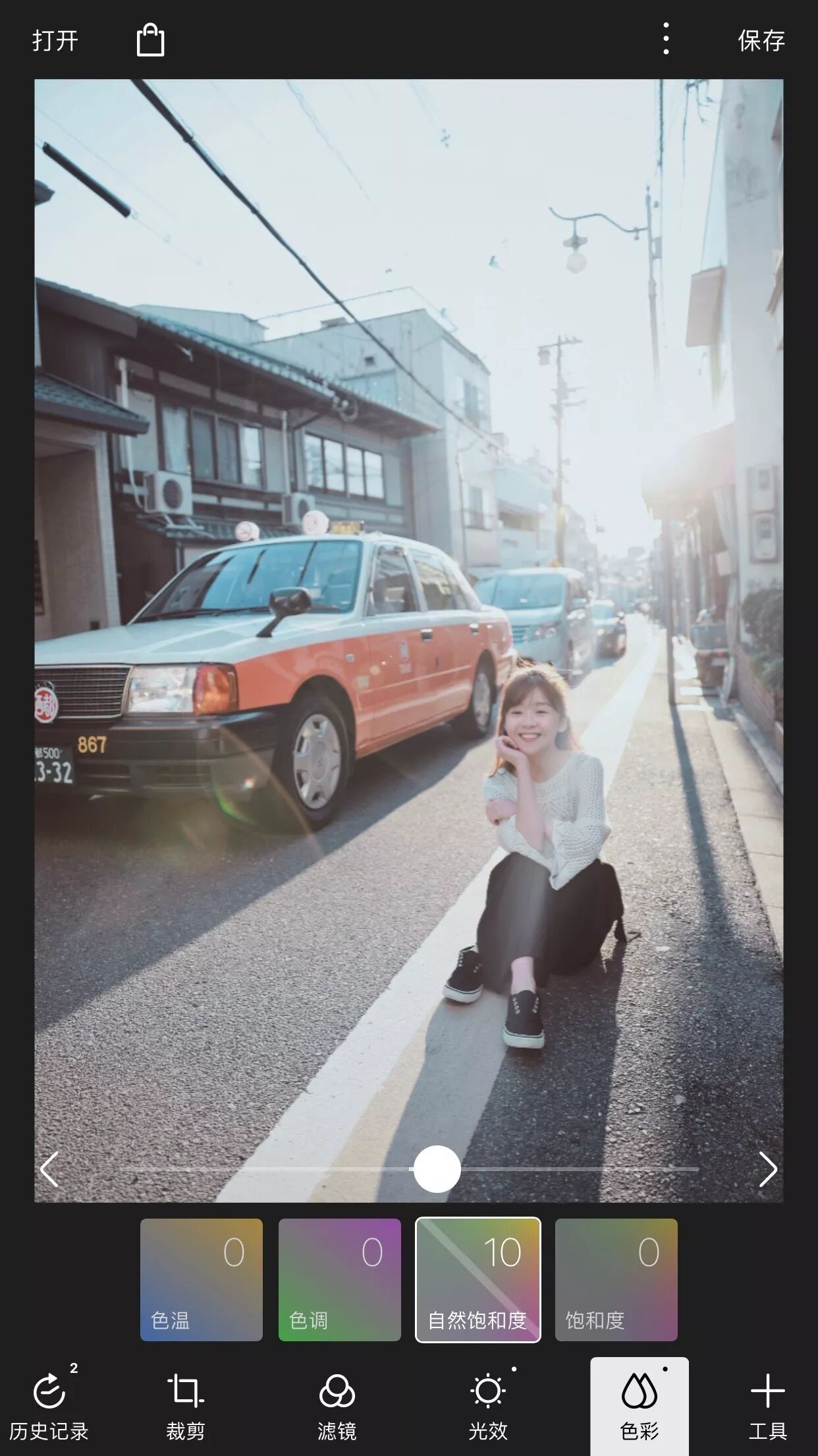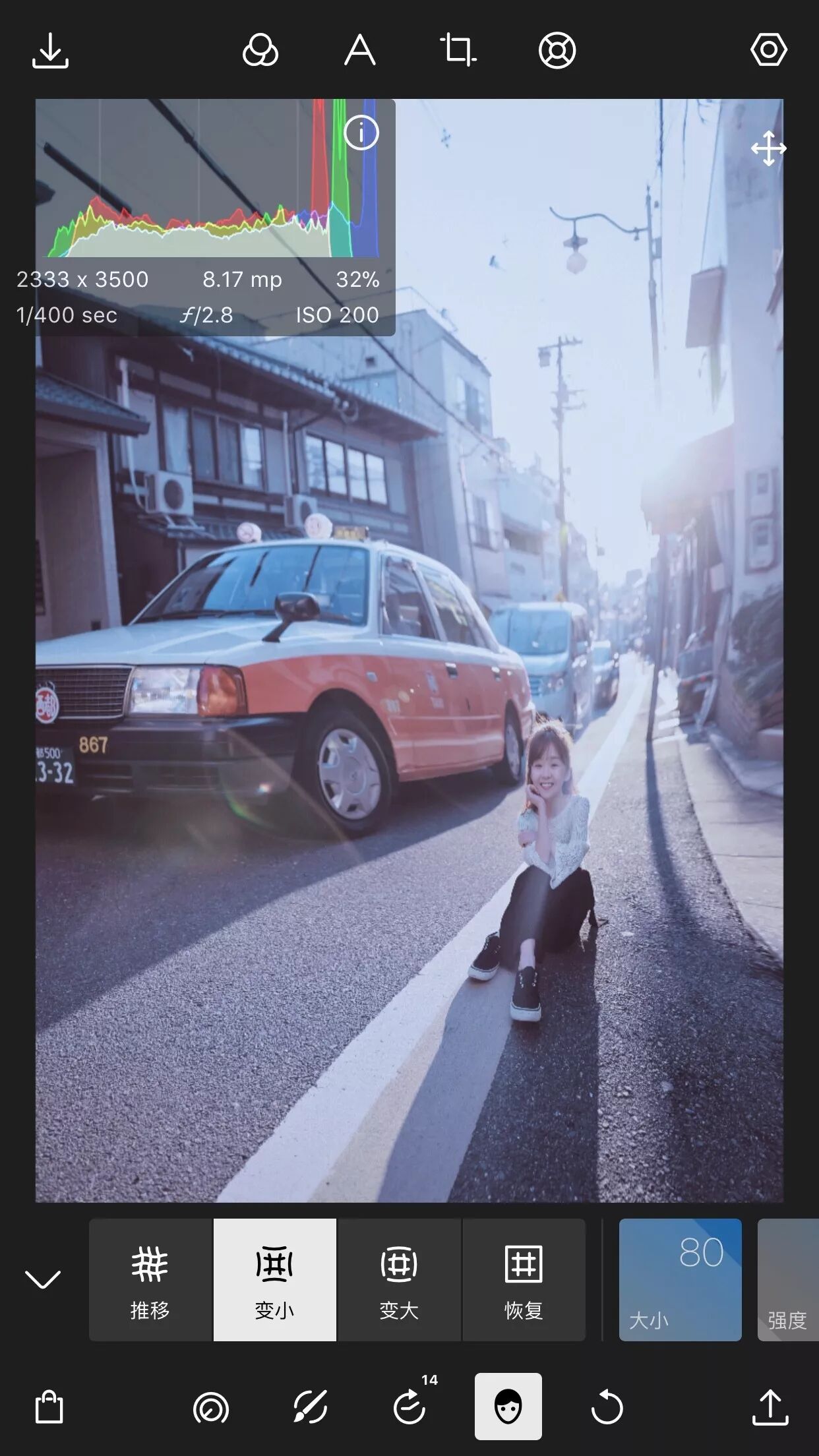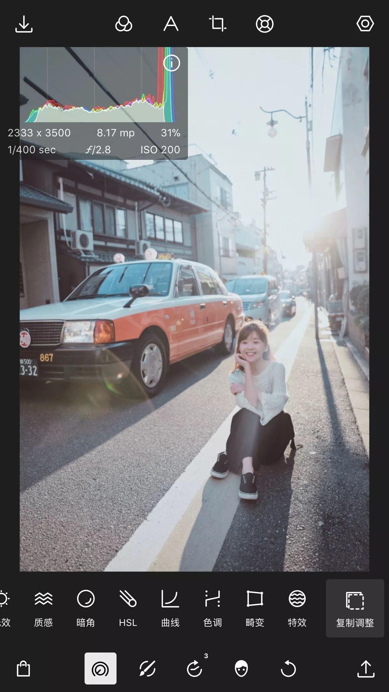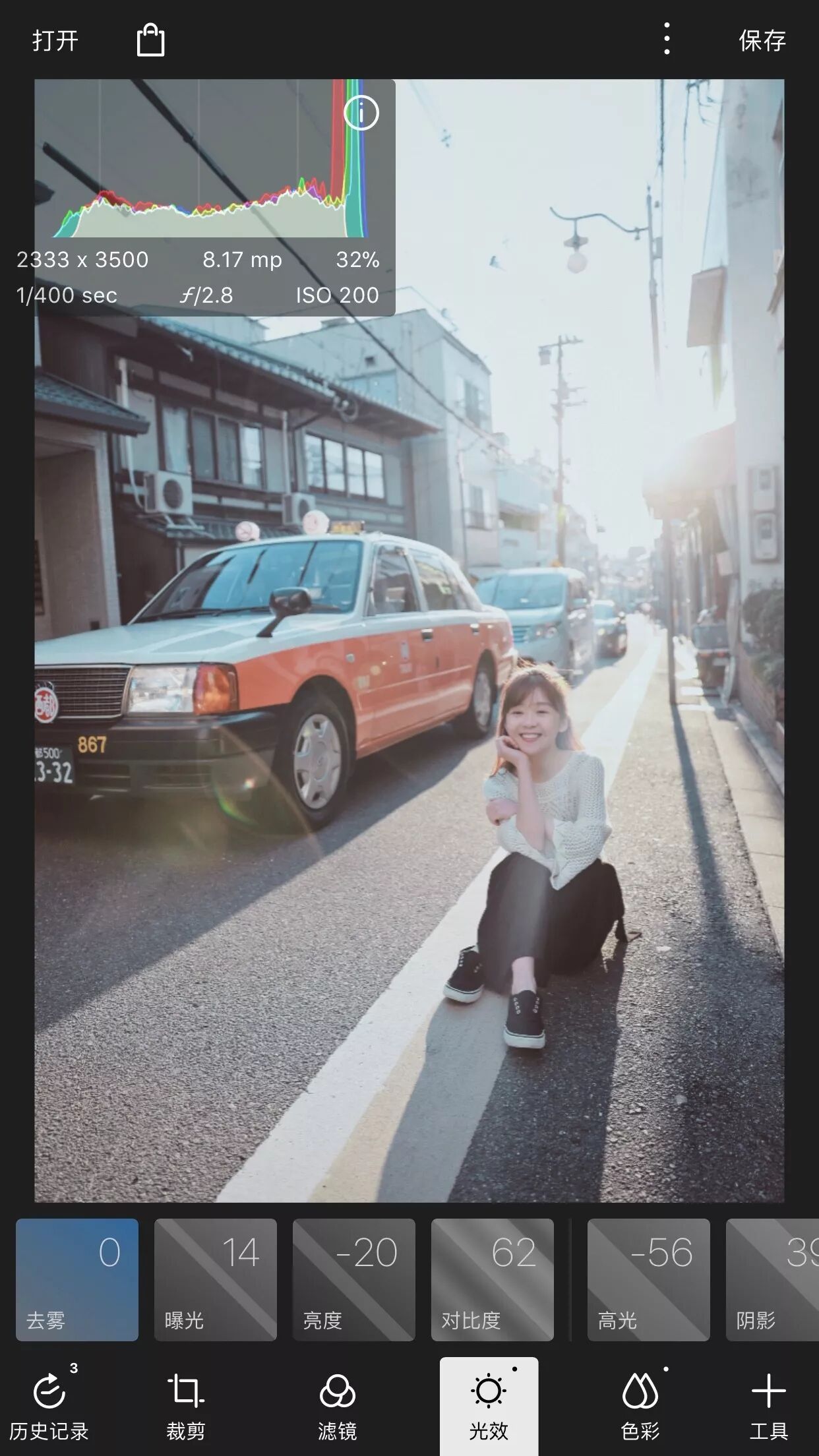 初学者模式调整的种类与方向,与其他APP类似,简单的裁剪、滤镜、光效、色彩等等,长按一下也有直方图,显示这张照片exif信息。