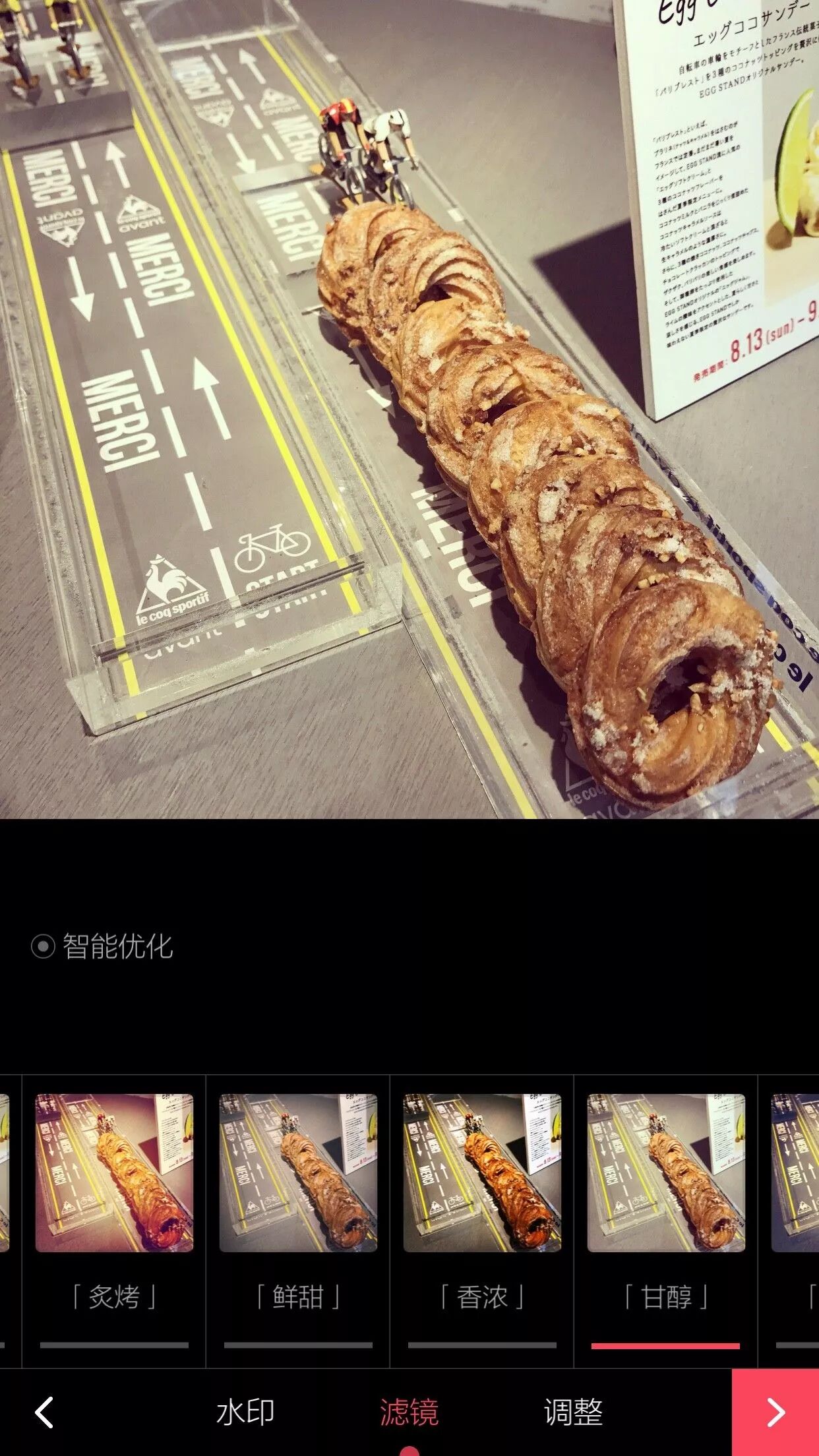 每当上一个菜,就打开食色,咔嚓验个毒,朋友圈和自己都能满足。它的滤镜挺有趣的,先是智能优化,然后让我们看看「炙烤」「鲜甜」「香浓」「甘醇」都代表啥吧哈哈哈。