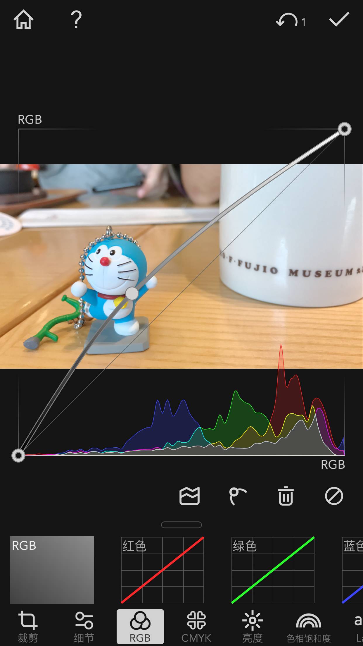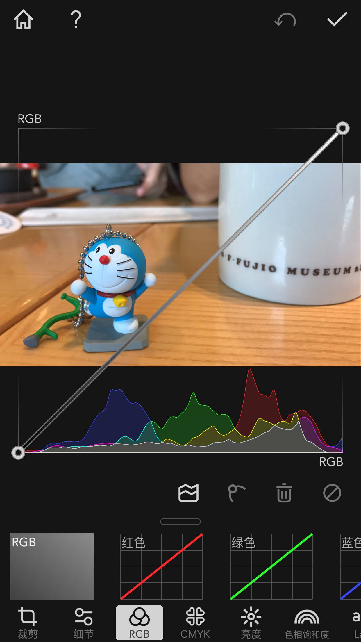 曲线调整呢,最大的应用是调整红绿蓝或者RGB在曲线上的值,通过改变曲线的弧度来修图。大家拿到一个APP,可以多尝试,看看每个功能是怎样的,最突出的特点是啥,再调整不迟。