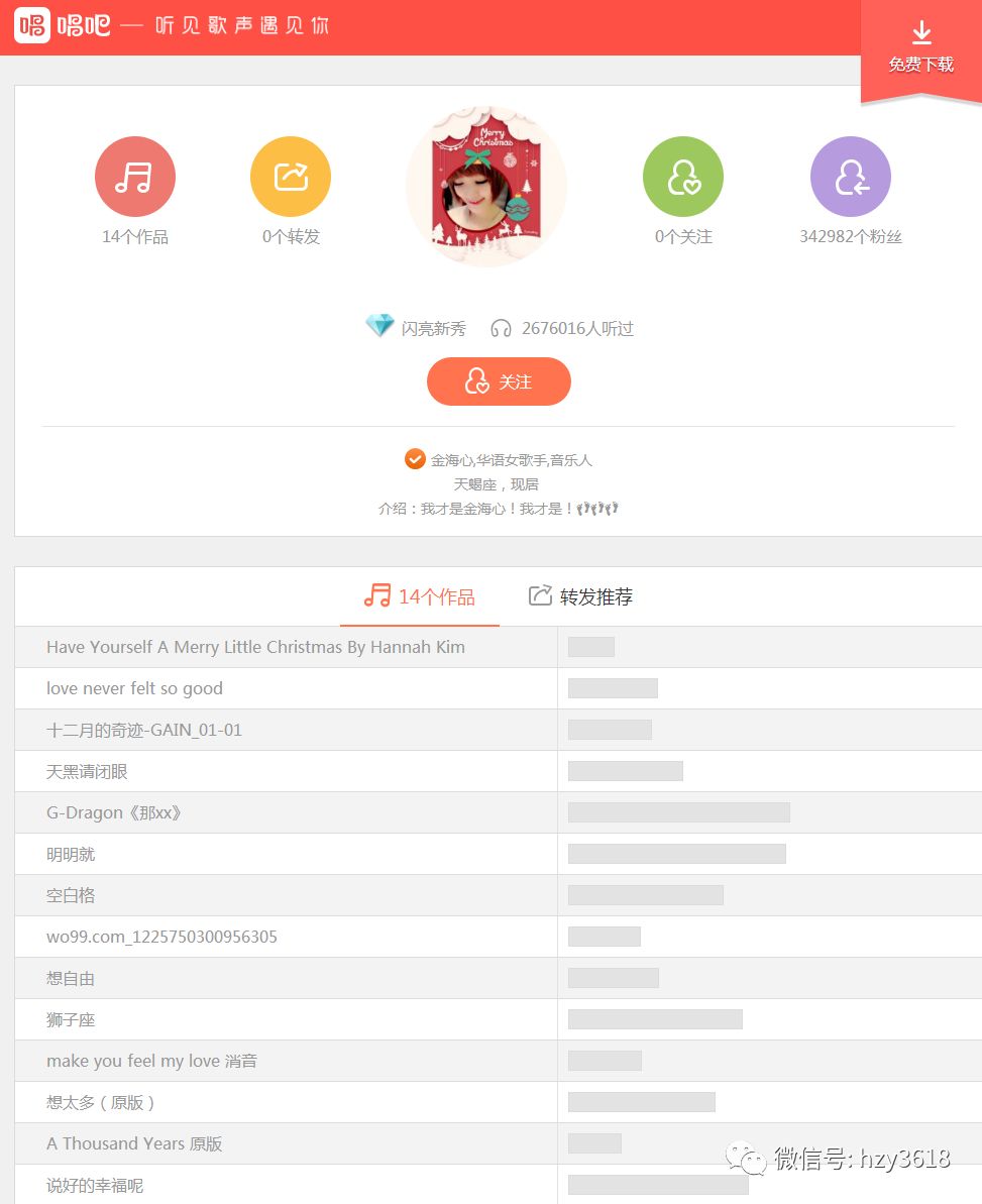 不似某些歌手或艺人常常见诸于报端、媒体,甚至蓄意炒作蹭热点、造噱头。关于金海心的消息鲜有听闻,本以为渐渐淡出或退隐,没想约莫三四年前,在唱吧还能看到她的个人主页http://changba.com/u/56819840,还特地注册了唱吧ID收藏。