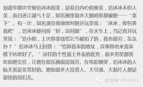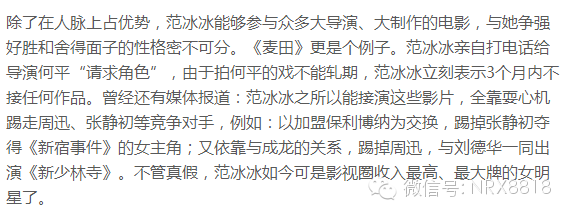 爽朗的性格让范冰冰人脉扩得很宽,除了英皇的杨受成、成龙对她青睐有加,保利博纳的于冬也跟她私交甚好。范冰冰如今是国内一线最当红女星,但对于她看中的影片,她就会抛开面子全力争取,有种舍我其谁的架势。想在娱乐圈混,主动出击也是一大优势。看看她自己的评价——“我会尽力做一个好的美丽戏霸,将戏霸进行到底! ”