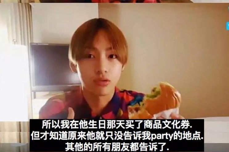 那个男生过生日,说给他买商品文化劵才能参加他的生日聚会,金泰亨就买了,可是那个男生都没有告诉他地址。