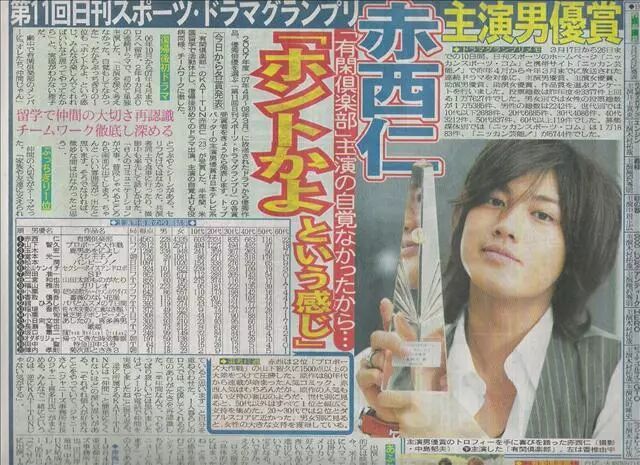 留学回来后的赤西仁并没有受到事务所惩罚,反而接下了自己的第一部主演《有闲俱乐部》,并且获得了日刊体育最佳男主角奖▼