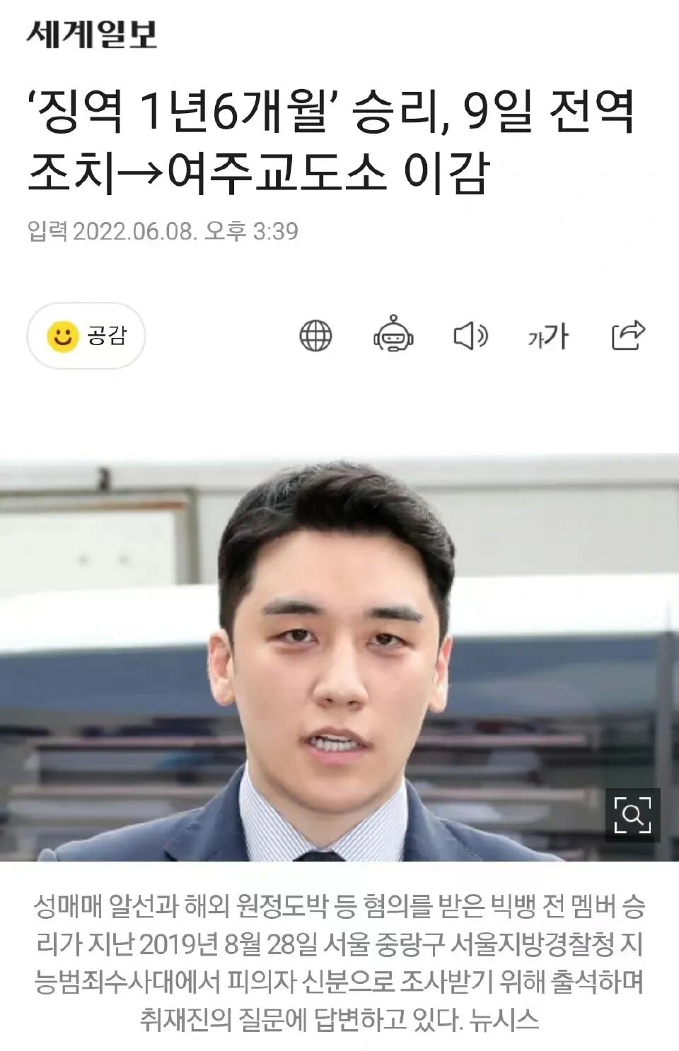 今天,陆军本部人事司令部根据兵役法施行令,将在9日对判刑1年6个月的胜利进行退伍处理(编入战时工作役),退伍当天,胜利将被移送到离京畿道利川市国军监狱最近的民间监狱"骊州监狱"。