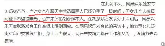 昨天胡彦斌经纪人在微博发声明,承认和郑爽分手了(传送门:突发!胡彦斌承认已和郑爽分手!柳岩怎么可能在炒作?!)今天就有报道称,郑爽爸爸之前接受网易娱乐采访时,就透露两人已经分手了一段时间。