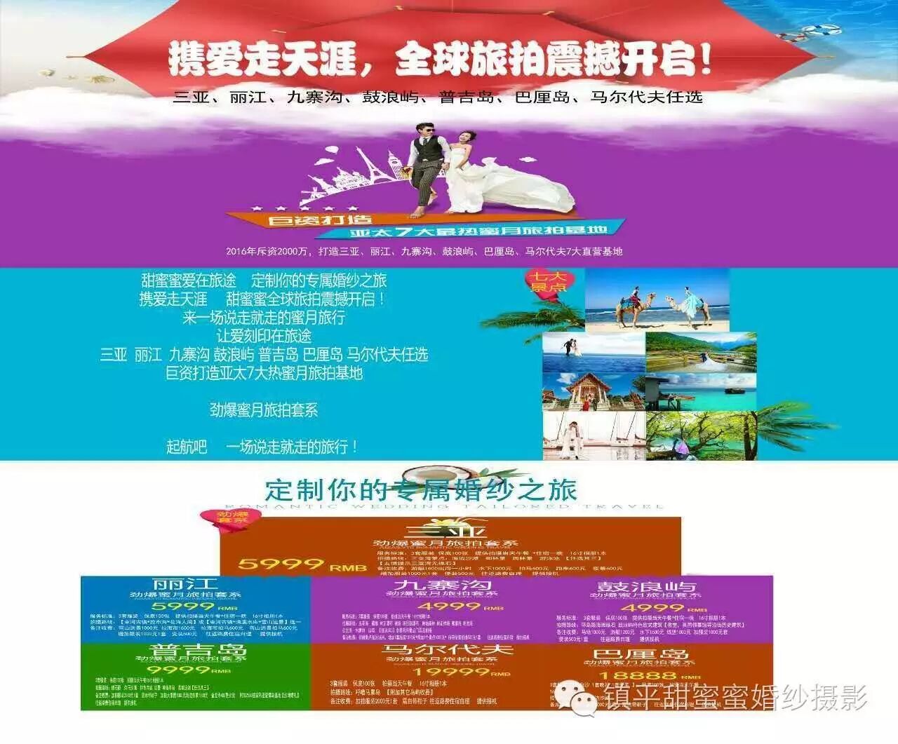甜蜜蜜婚纱爱在旅途,旅拍7大热拍旅游基地,三亚,丽江,鼓浪屿,九寨沟,普吉岛,巴厘岛,马尔代夫!有需要的亲们,可以联系我吆!出国旅拍的可以提前预约,能你提供办出国相关的手续甜蜜蜜婚纱旅拍日照特惠价3999元!每周五发车旅游,拍照,游玩,吃喝,住宿,专车开往日照,很方便吆!送放大,送相册,送摆台!拍婚纱照,拍亲子照,拍闺蜜照,拍情侣照都可以预约!另直拍好莱坞,富沃大型摄影基地联系电话13598264910座机65931689