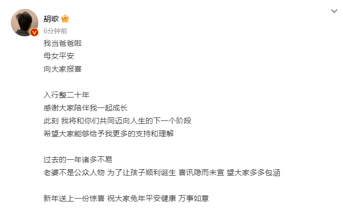 1月31日下午,演员胡歌发布微博,官宣当爸,目前母女平安。全文内容如下: