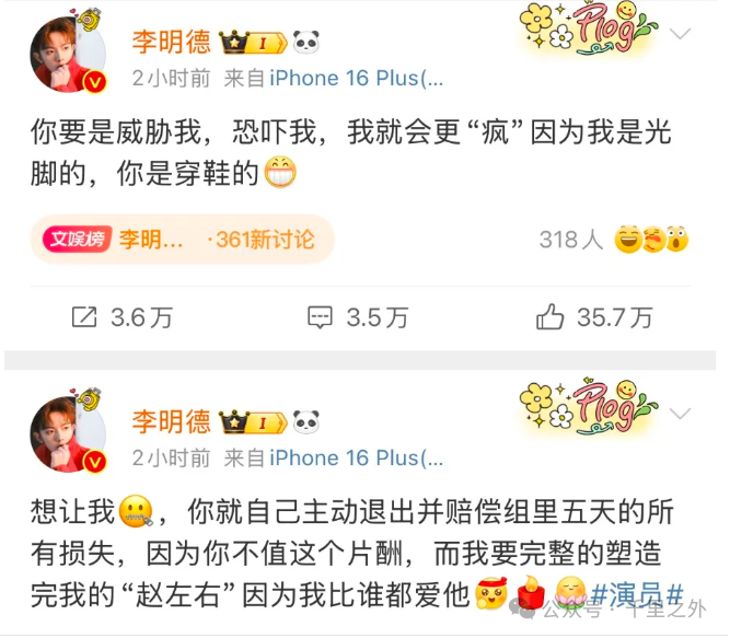 回看整个事件,李明德就像是一个不小心踩到地雷的路人。他可能早就预料到了后果的严重性,所以在最后的爆料中喊话马天宇:"想让我闭嘴,那就主动退出剧组,还得赔偿损失。"这话听起来硬气,却难掩几分无奈。