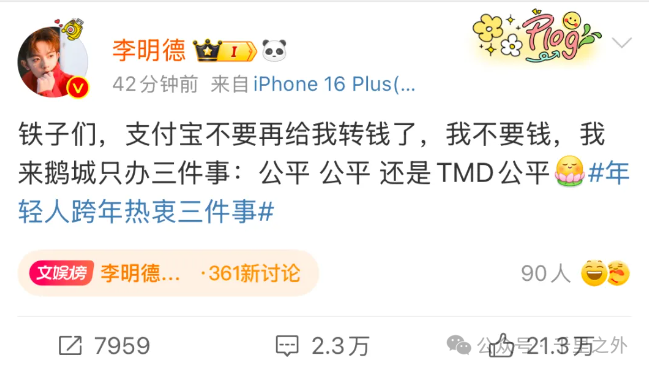 有趣的是,就在李明德爆料的同时,马天宇还在悠哉游哉地在社交媒体上分享着工作日常。这强烈的反差,让网友们不禁为李明德叫屈:"这就是所谓的大小咖待遇差距吗?"