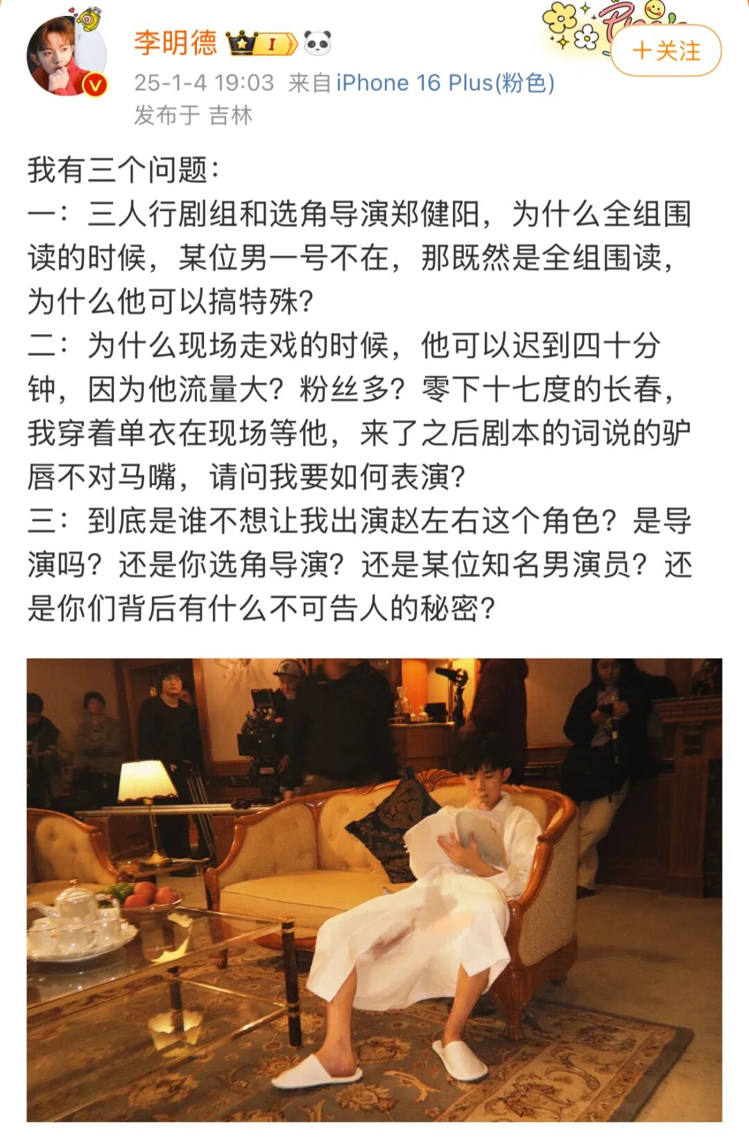 故事要从新剧《三人行》说起。1月4号的下午,李明德先是在社交平台上发了一封感谢信,字里行间充满了对剧组的感激之情。谁知这封信竟成了引爆全网舆论的导火索,紧接着他就像打开了话匣子,连发7条爆料,矛头直指剧中的男一号马天宇。