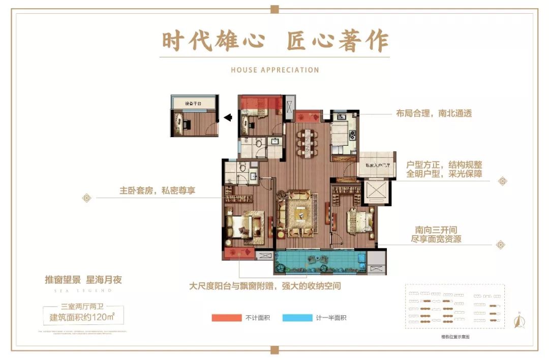主卧套房,私密尊享;南向三开间,尽享面宽资源;大尺度阳台与飘窗附赠。