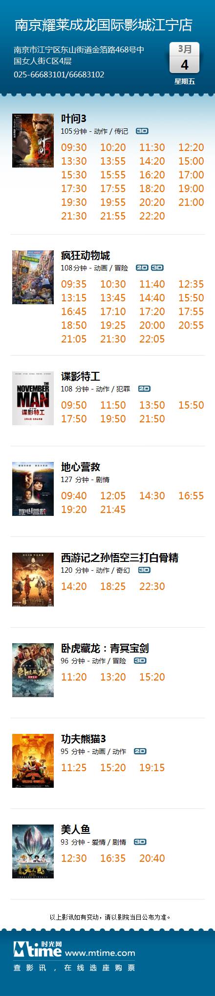 南京耀莱成龙国际影城江宁店3月4日影讯