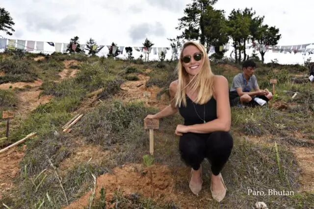 由于旅行搭乘了200多次飞机,认为对环境造成了破坏的她,每到一个地方就会找机会种下一棵树,并借此宣传可持续旅游的概念。