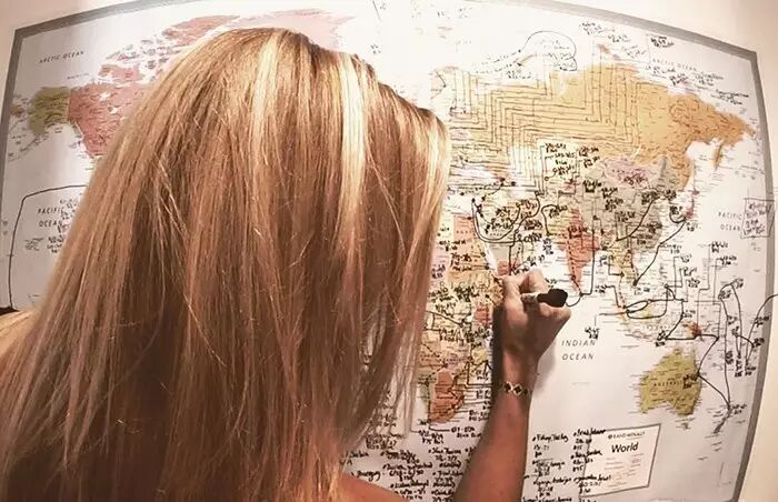 有了这一坚定的想法,她第一时间就跑到商店买了张大大的世界地图,回家张贴在自己的房间,每天开始不停地在地图上描描写写,认真规划自己这场旅行的路线。