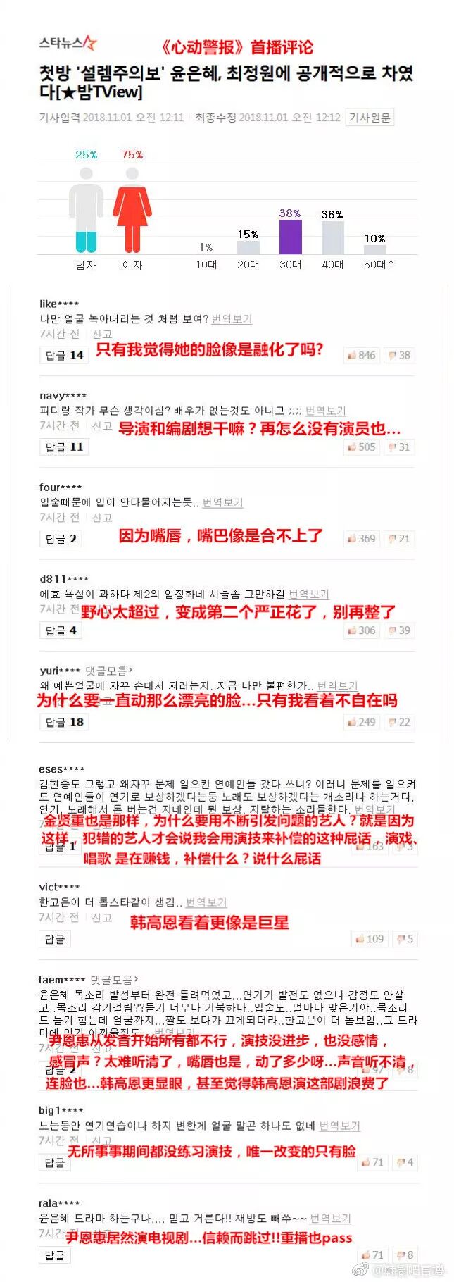 评论一方面针对尹恩惠看起来有些奇怪的脸,一方面质疑女演员那么多,为什么要用有丑闻的演员