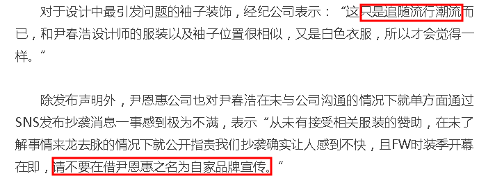 抄袭事件爆发两日后,经纪公司才出面否认,说不能因为流行了很久的荷叶边就判定抄袭,还直指对方是利用尹恩惠炒作自己的品牌