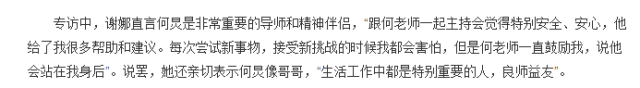 好在后来,加入《快乐大本营》的谢娜遇到了何炅。谢娜说,何炅是她的精神伴侣和人生导师,会给她许多帮助和建议。