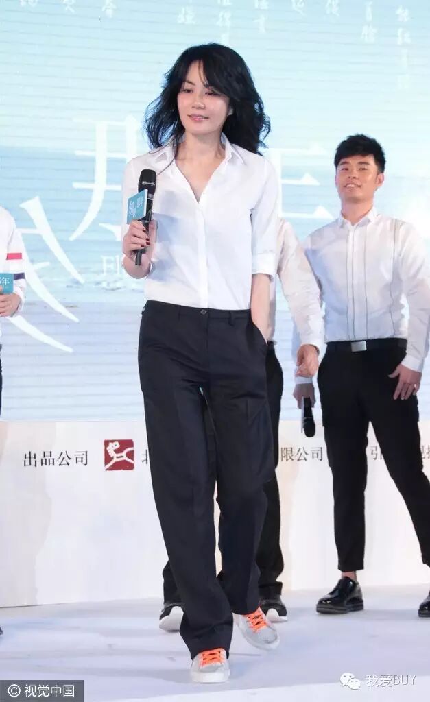 在《匆匆那年》发布会上还穿过彩色鞋带款,王菲能把白衬衣+黑裤子+小脏鞋穿这么好看!这样的搭配你们也可以get起来,简单又灰常时髦。