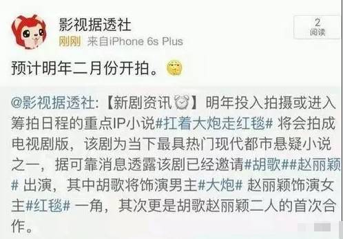 这不,最近有消息称,两人将会在明年一起合作一部ip新戏,《扛着大炮走红毯》(不要在意名字哈哈)。网友们似乎看到了胡歌脱单的希望,纷纷喊话赵丽颖:我胡的终身大事就看你啦!