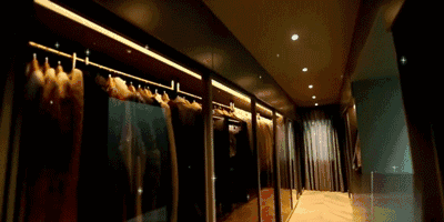 女生看了想入室抢劫的自动衣帽间。衣柜上有一个钮,只要有人路过衣橱的灯光就会亮起来。帽间的焦糖色与走廊、卧室的蘑菇色形成不同层次,温柔而安静。