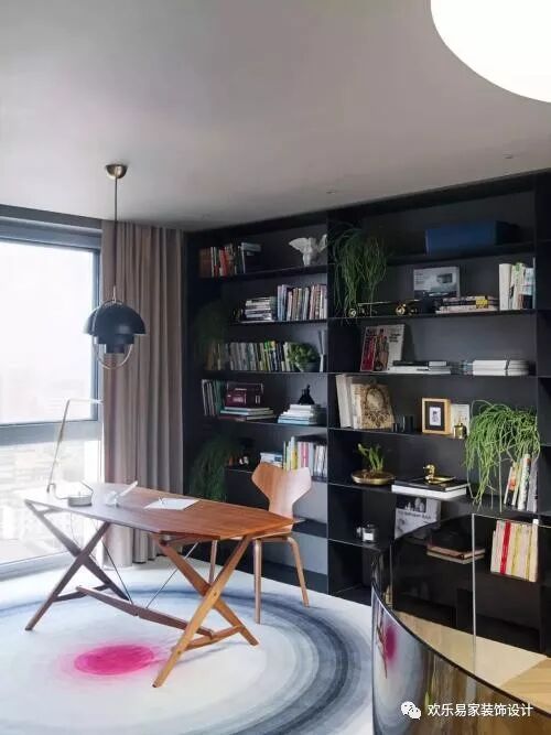 这样一个气派大屋,一个大气的书房可少不了。大面积的落地窗,整墙的哑光黑书柜在光照的反射下并未显得过于厚重,反而更加突出房间温润的木制桌椅,不争不抢,凸显自然美。