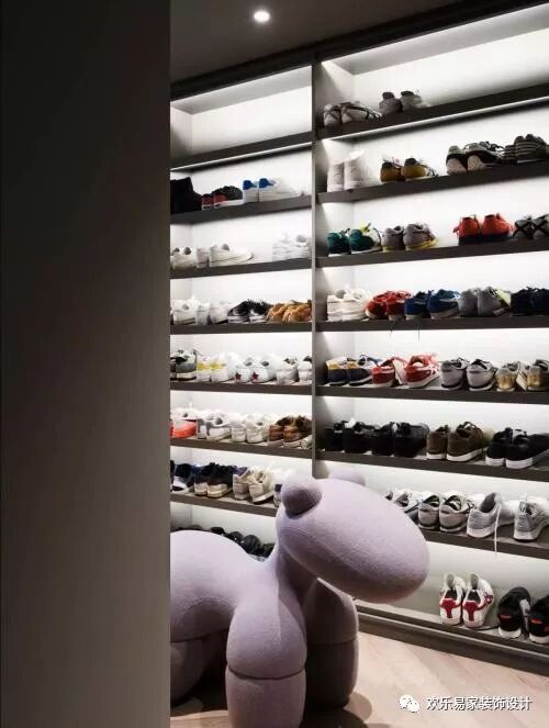 拥有一整壁的鞋子,人如其名,井井有条地摆放着。旁边的Eero Aarnio Originals Pony座椅也为空间增添了几分童趣。