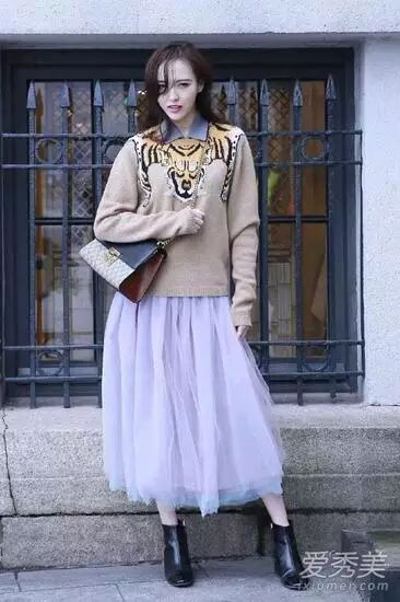 驼色针织衫加入老虎图案的设计,瞬间变得时髦又霸气,搭配浅紫色纱裙仙气十足,彰显梦幻与浪漫。