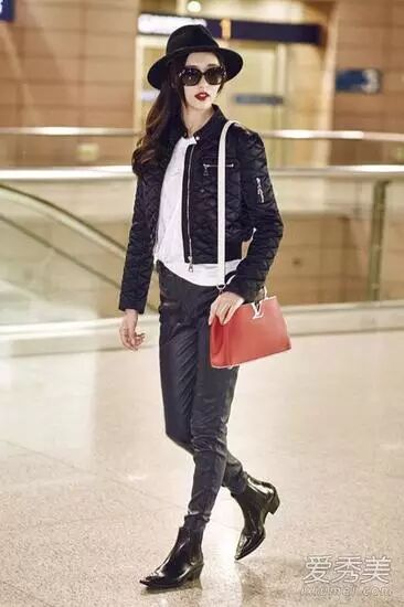 短款皮夹克配白T恤和黑色紧身裤,尖头短靴相当个性,红色挎包采用白色肩带,十分别致,明艳不失清新。