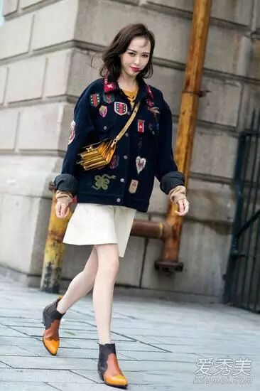 满是图章的休闲外套配白色短裙和拼色短靴,一双筷子腿格外吸睛,帅气不失甜美,小巧的黄色风琴包很有春日的明媚气息。