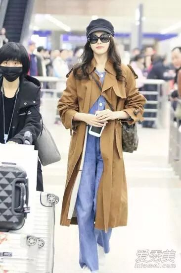 驼色风衣配牛仔背带裤很有韩范儿,也只有唐嫣这种瘦高个能驾驭这种look了。