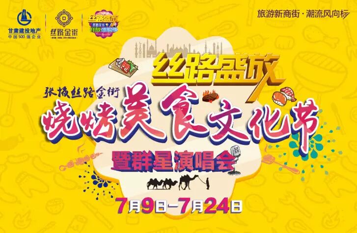 7月9日-24日,张掖丝路金街“烧烤美食文化艺术节”,特别邀请上海大世界基尼斯纪录创造者——新疆著名的烧烤大师莫明·吾甫尔助阵,现场表演烤制整只骆驼绝技。同时,中华名小吃,台湾特色小吃,国外风味小吃,进口零食、咖啡、糕点等等天南海北美味盛宴将在张掖丝路金街“烧烤美食文化艺术节”惊艳亮相,满足您的挑剔味蕾。
